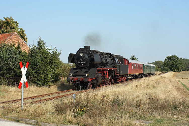 Anläßlich der 825-Jahr-Feier der Stadt Arendsee fuhren die Salzwedeler mal wieder mit ihrer 50 3682 Pendelzüge Salzwedel-Arendsee und zurück, bei Ritze rollt der Zug bei einer der Rückfahrten Salzwedel entgegen, 20.09.2009.