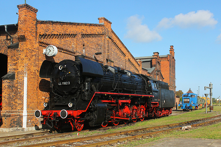 Am 30.09.2023 ging es wieder zum Dampflokfest nach Staßfurt. Die nicht betriebsfähige 44 1182 stand fotogen am Schuppengiebel. |