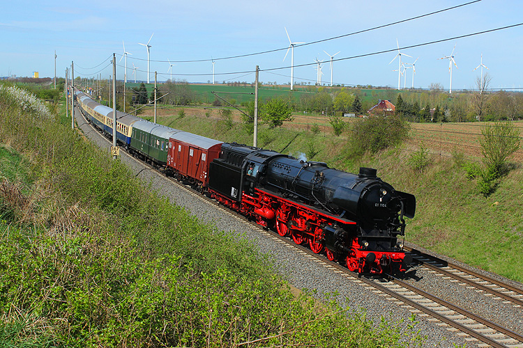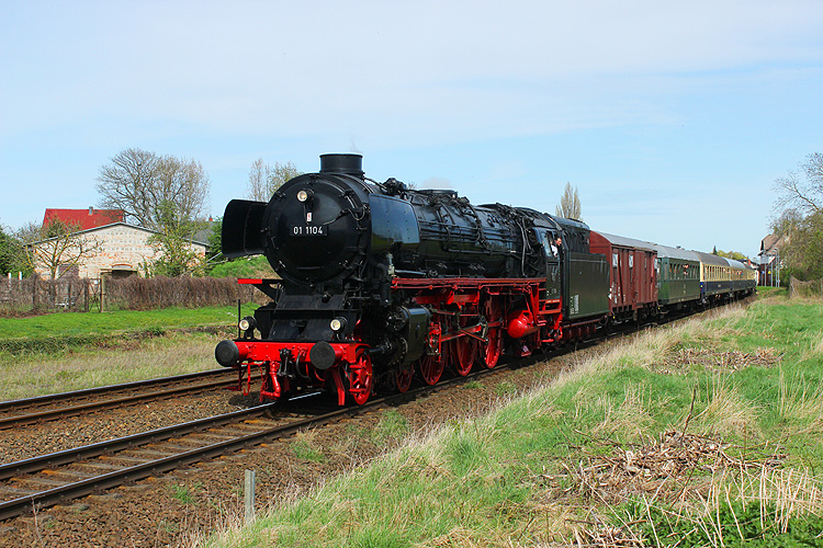 Am 06.04.2024 war 01 1104 mit einem Sonderzug von Oberhausen zum Dampflokfest in Staßfurt unterwegs. Ich wartete bei Ovelgünne auf diesen Zug, leider hatte der Lokführer den Regler auf der hier abschüssigen Strecke schon geschlossen. |