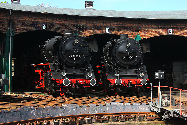 Die beiden Staßfurter 44 nebeneinander im Lokschuppen. |