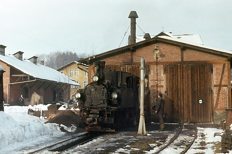 Irgendwie bedrückend war die Stimmung bei meinem ersten Besuch in Wolkenstein am 26.02.1983. In der Nacht zuvor waren "Eisenbahnfans" in den Lokschuppen eingebrochen und hatten die Schilder von 99 1582 geklaut. So mußte die Lok ohne diese den P 14287 nach Jöhstädt bespannen, Samstags verkehrte nur ein einziges Personenzugpaar nach Jöhstädt und zurück. |