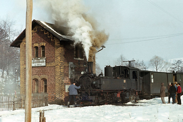 Mit dem P 14287 Wolkenstein - Jöhstädt hat 99 1582 den Bahnhof Steinbach erreicht, 26.02.1983. Die Lok nimmt nun Wasser, diese Szene kann man an den Fahrtagen der heutigen Museumsbahn wieder erleben. |