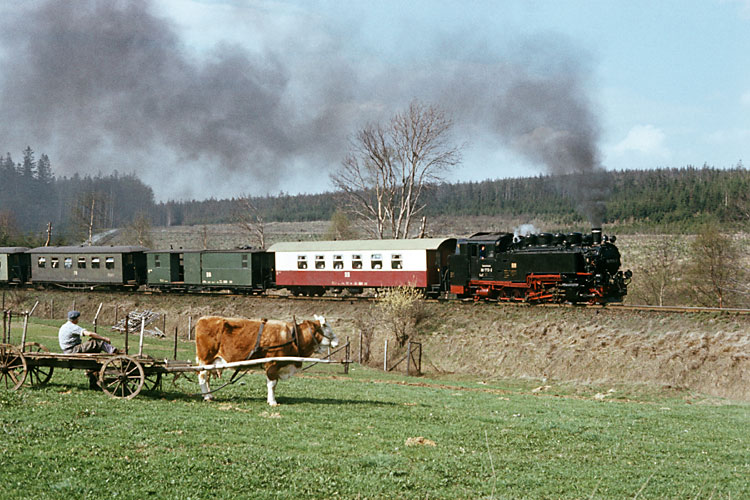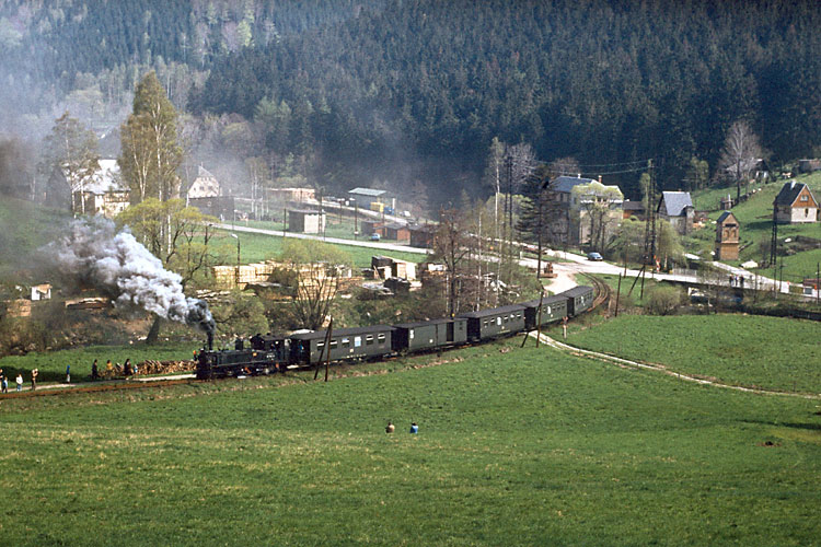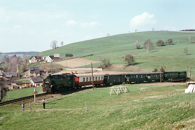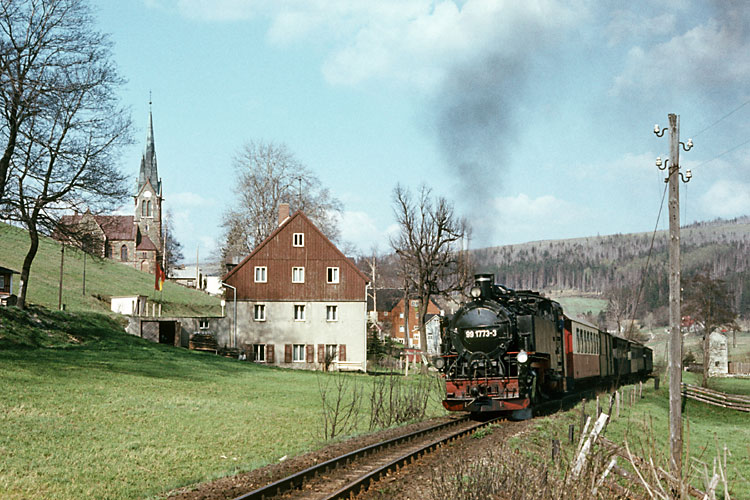 Bei einer viertägigen Tour durch Sachsen schaute ich am 01.05.1987 wieder an dieser Strecke vorbei. Mit dem P 14319 war 99 1773 nach Oberwiesenthal unterwegs, aufgenommen in Unterneudorf. |