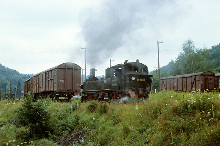 Als ich am 01.08.1985 das nächste Mal in Wolkenstein vorbeischaute, war der Personenverkehr auf der Schmalspurbahn längst eingestellt. Im Güterverkehr war die Bahn auf dem Abschnitt Wolkenstein - Niederschmiedeberg aber noch unverzichtbar, 99 1585 rangiert sich hier ihren Güterzug zusammen. |