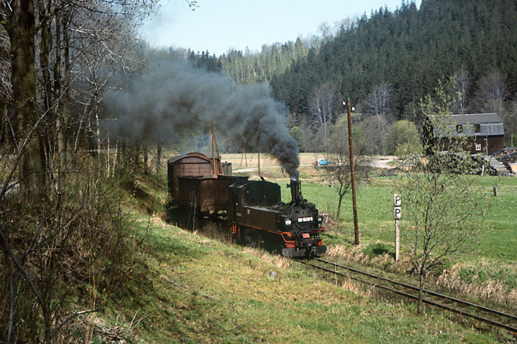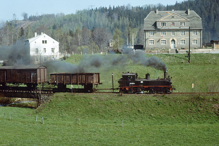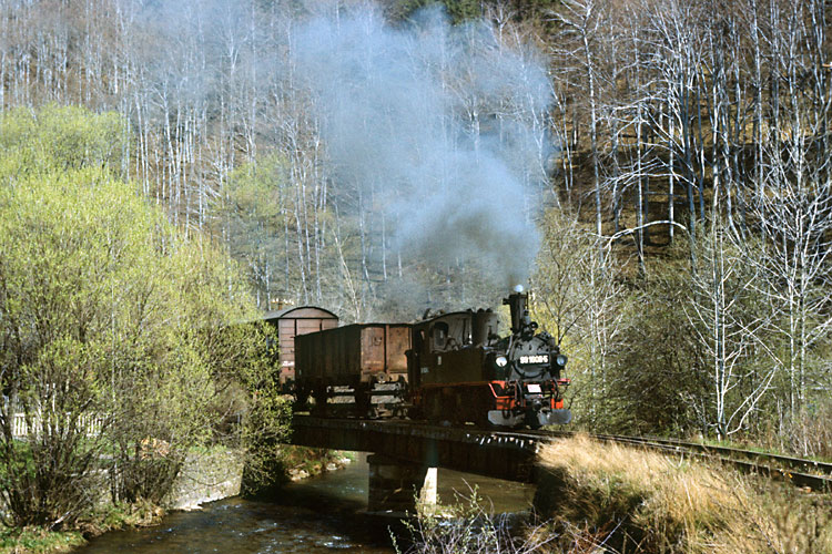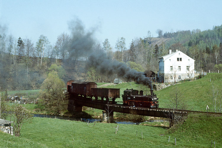 Eigentlich sollte auch der verbliebene Güterverkehr nach Niederschmiedeberg zum Jahreswechsel 1985/86 endgültig eingestellt werden, aber die Straßenbauarbeiten verzögerten sich weiter. So konnte ich nochmals bei einer viertägigen Fototour durch Sachsen am 03.05.1986 Aufnahmen an dieser Strecke machen. Dieses Mal war 99 1606 im Einsatz, hier überquert sie mit ihrem Güterzug bei Streckewalde eine der vielen Brücken über die Preßnitz. |