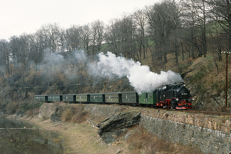 Am 29.03.1991 war ich bei einer Dampfsonderfahrt auf der Strecke Dresden - Altenberg dabei. Nach Ankunft des Zuges in Altenberg besuchte ich das bislang einzige Mal die Weißeritztalbahn Freital Hainsberg - Kurort Kipsdorf. Unter anderem nahm ich dabei 99 1780 mit dem P 14265 an der Talsperre Malter nahe Dippoldiswalde auf. |