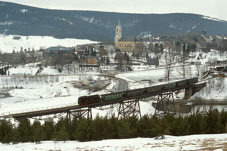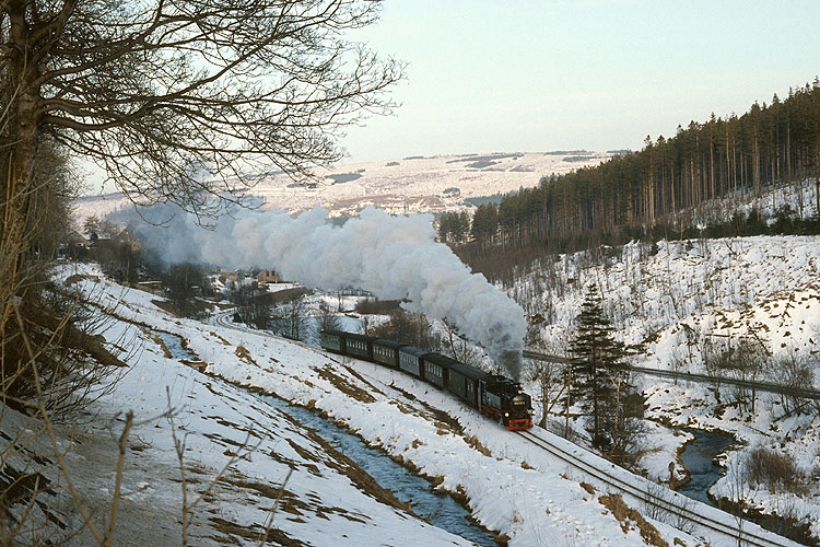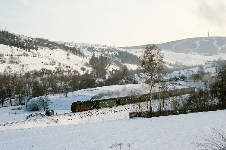 Wieder zwei Tage später war ich letztmalig an der Strecke, als 099 737 mit dem P 14310 nach Cranzahl Oberwiesenthal verließ, 26.02.1992. Nach diesen wenigen Bildern von den sächsischen Schmalspurbahnen geht es auf den nächsten Seiten mit den Harzer Schmalspurbahnen weiter, wo ich natürlich desöfteren unterwegs war. |