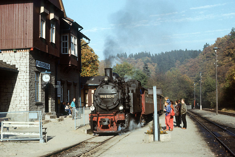 Am 04.10.2003 war ich nach langen Jahren mal wieder im Selketal nach dem Rechten schauen und hatte das Glück, 99 6001 und 99 5906 im Einsatz zu erleben, wie in alten Zeiten! Der Wasserkran wurde inzwischen an den Bahnsteig versetzt, ansonsten hat sich im Bahnhof Alexisbad bis heute nicht viel verändert. So kann man hier noch immer echte Schmalspurbahn-Romantik erleben, besuchen Sie doch einmal diese tolle Strecke, es lohnt sich! Auf den nächsten Seiten geht es nun mit der Harzquerbahn weiter. |