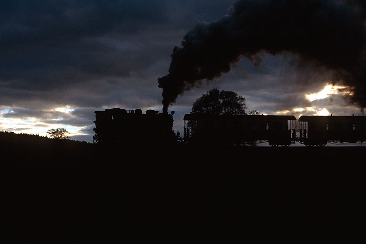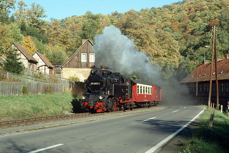 Erst drei Jahre später war ich wieder im Selketal unterwegs. Dieses Mal fuhr der P 14465 mit 99 6001, aufgenommen in Mägdesprung, 15.10.1989. |