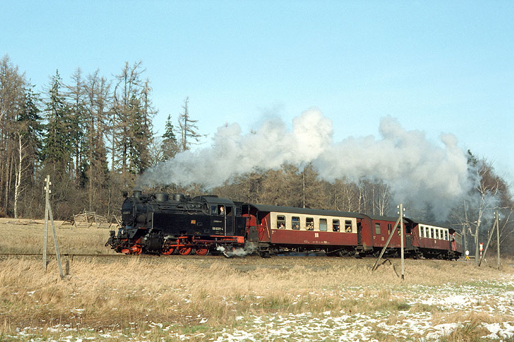 Im schneearmen Winter 1990 war ich wieder einmal an der Selketalbahn unterwegs. Ungeachtet der großen politischen Veränderungen lief der Betrieb wie gehabt weiter. 99 6001 war wieder einmal mit dem P 14465 von Gernrode nach Hasselfelde unterwegs, hier die Ausfahrt Sternhaus-Haferfeld, 17.02.1990. |
