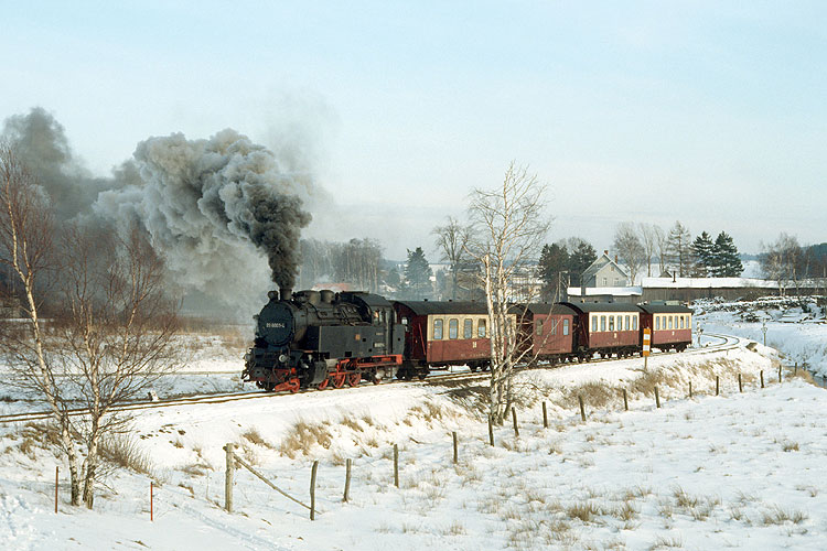 Wenig später rollt 99 6001 mit dem P 14465 nach Alexisbad herein, 17.02.1990. |