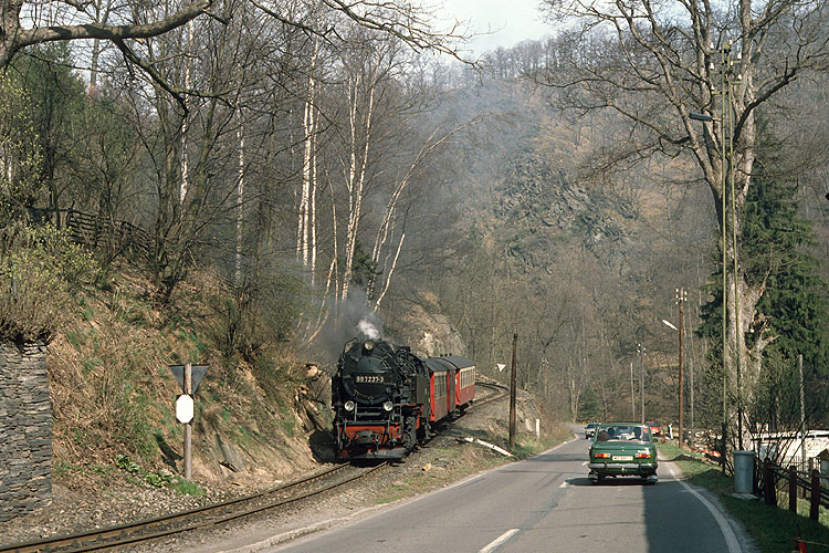 Den Nachmittagszug P 14465 nach Hasselfelde hatte an jenem Tag wieder einmal 99 6102 am Haken, die eigentlich nur selten im Personenzugdienst eingesetzt wurde. Ihr Zug bestand bereits aus modernisierten Wagen, die nun auch im Selketal zum Einsatz kamen, soeben hat er den Bahnhof Mägdesprung in Richtung Alexisbad verlassen. |