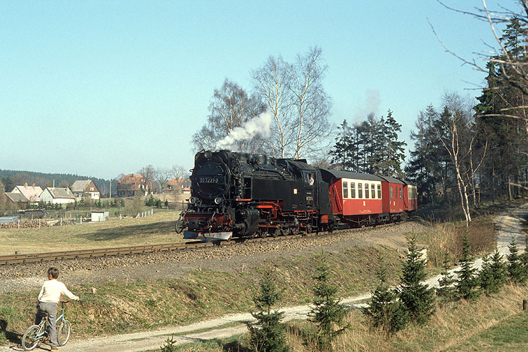 99 7237 rollt bei Mägdesprung mit dem P 14465 in Richtung Alexisbad, 31.03.1990. |