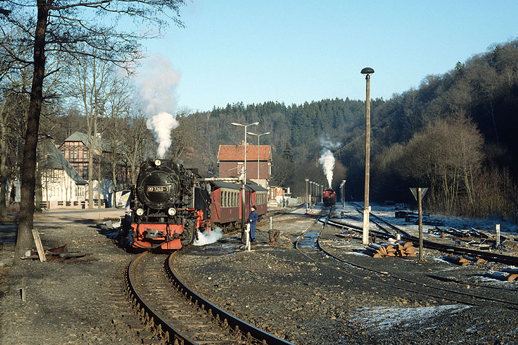 Vor dem P 14465 nach Hasselfelde nimmt 99 7240 im Bahnhof Alexisbad Wasser, während sich im Hintergrund 99 7235 nun auf die Heimfahrt nach Gernrode macht, 18.01.1991. |