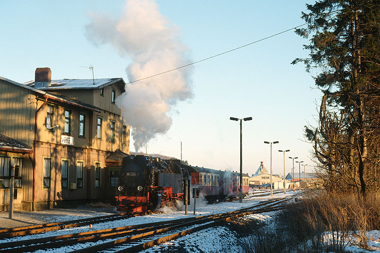 99 7240 fährt mit dem P 14465 aus Stiege aus, 18.01.1991. |