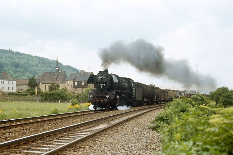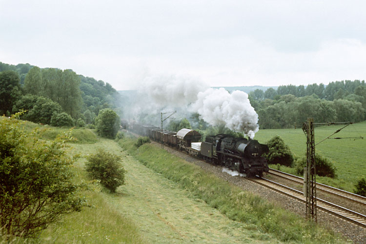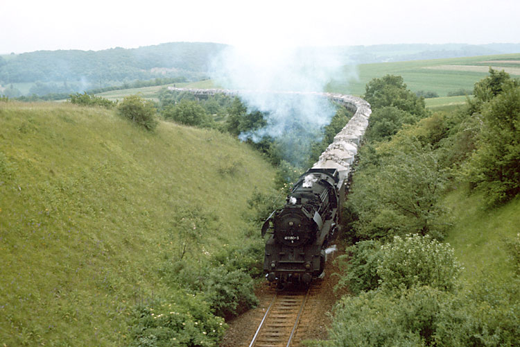 Die Lok vom Zementleerzug war indessen schon wieder als Leerfahrt nach Großheringen gefahren, um den N 66467 nach Göschwitz abzuholen. So wurde auch das elektrifizierte Stück der Saalebahn mit Dampf befahren. 41 1180 ist nun mit dem Nahgüter bei Stöben in Richtung Süden unterwegs, 16.06.1984. |
