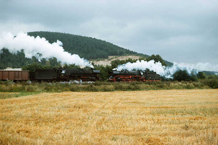 Auf der zweigleisigen Saalebahn konnte man mit etwas Glück auch Dampfzugbegegnungen auf freier Strecke erleben. So trafen sich hier am 05.09.1985 bei Remschütz die leer nach Göschwitz fahrende 41 1182 und 41 1225 mit dem Dg 50629 nach Saalfeld. |