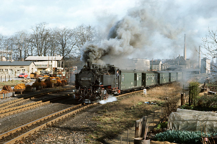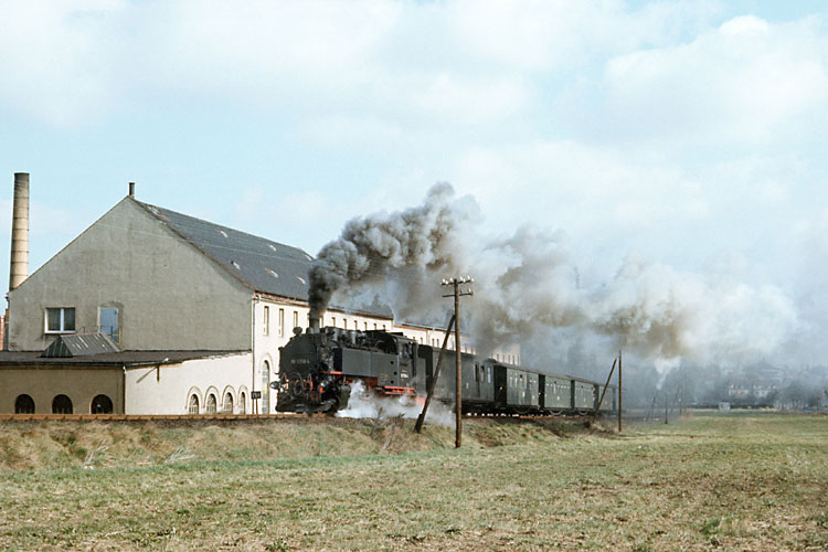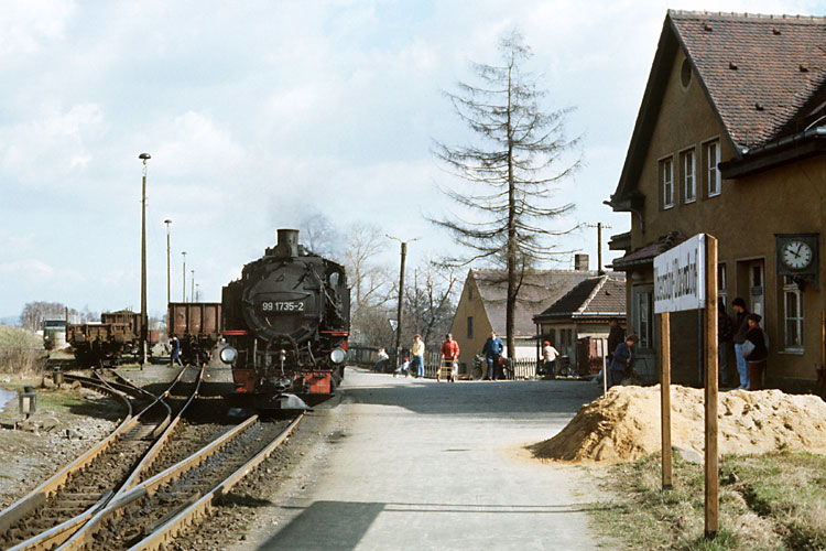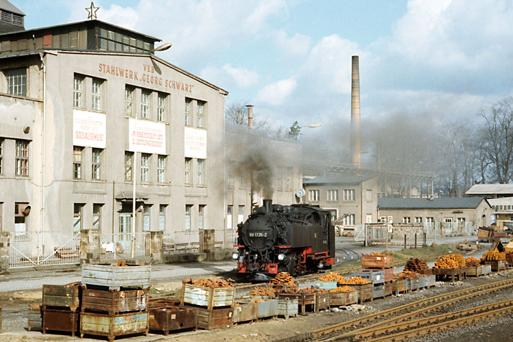 Gleichzeitig war noch eine zweite Lok im Bahnhof Zittau-Vorstadt zu sehen, 99 1735 rangierte sich ihren Nahgüterzug 67282 nach Olbersdorf-Oberdorf zurecht. Sie hat dem "VEB Stahlwerk Georg Schwarz" soeben einen Wagen zugestellt und rollt nun wieder an ihren Zug. Noch hingen am Gebäude des Stahlwerkes die einst allgegenwärtigen politischen Parolen, die zu jener Zeit in der DDR schon spürbar weniger geworden waren. |