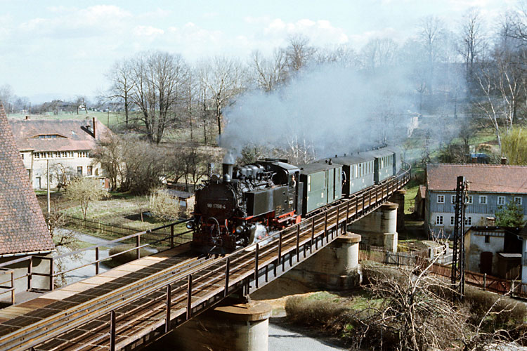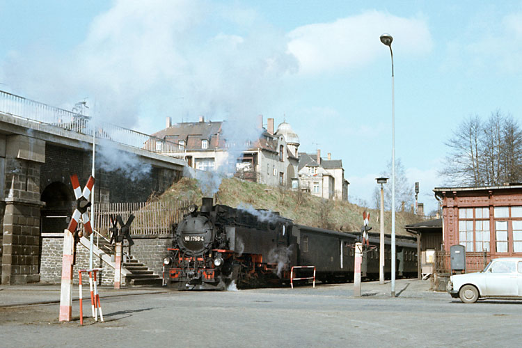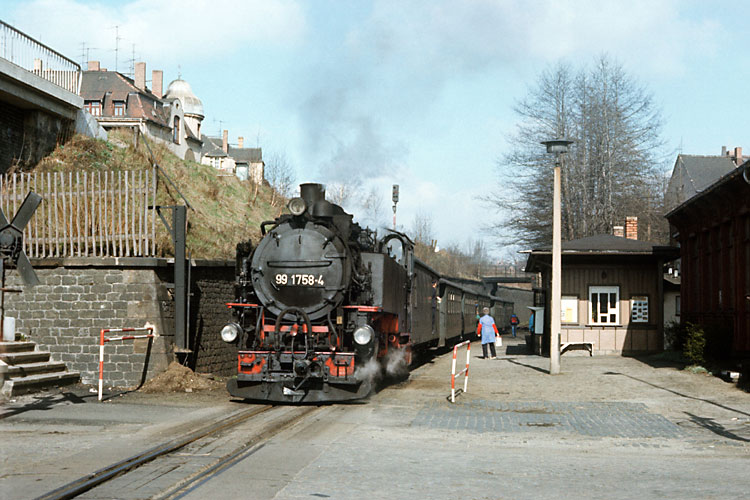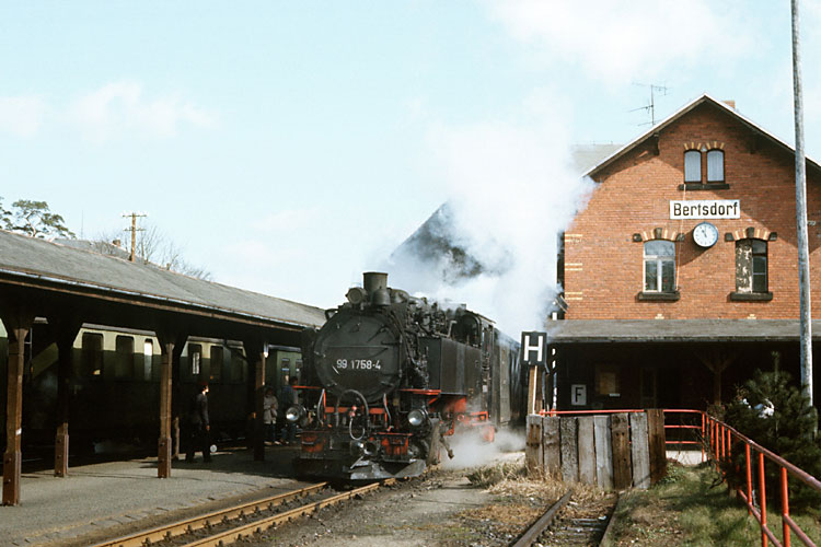 Nun hat 99 1758 mit dem Zug den Trennungsbahnhof Bertsdorf erreicht. |