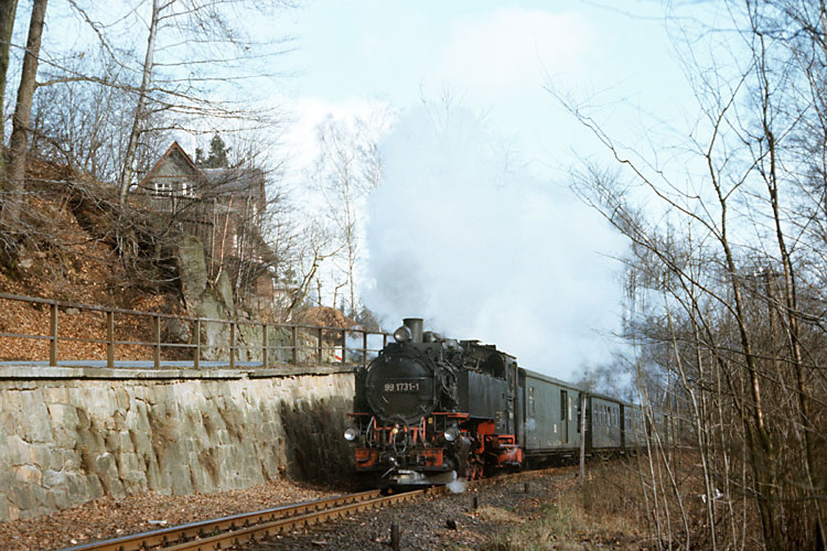 Nach Zittau angereist war ich bereits am Vorabend, so konnte ich am Morgen des 25.03.1989 gleich richtig loslegen. Da mir die Strecke noch völlig unbekannt war, arbeitete ich mich zunächst langsam von Zittau aus bergwärts vor. So nahm ich unter anderem 99 1757 mit dem P 14072 nach Oybin bei der Ausfahrt aus dem Bahnhof Zittau-Vorstadt auf. |